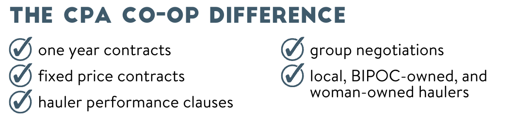 Large trash hauling corporations often take advantage of nonprofits and other community institutions by signing them up for auto-renewing, auto-escalating contracts with highly variable pricing. To combat these practices, we’ve written our own contract and identified local, BIPOC-owned, and woman-owned haulers.